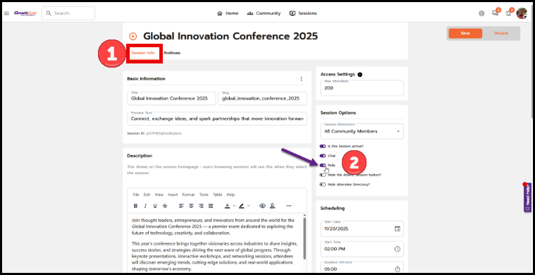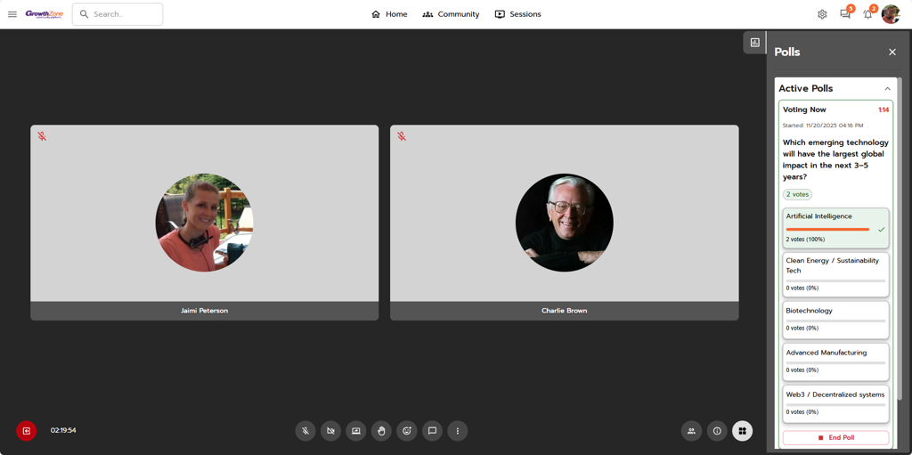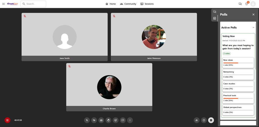 Session Polls is an easy-to-use polling feature that enables organizers and moderators to collect instant audience responses during a session. Session Polls help to boost engagement, provide session leaders with real-time insights, and support more interactive, dynamic sessions.